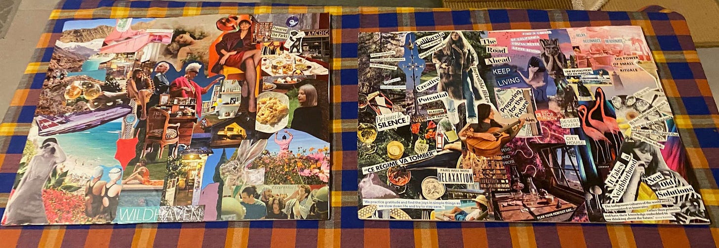 This past weekend I got together with friends for our annual vision board making brunch. It was a welcome gathering to break my urge to isolate when times feel hard. I joked that all of my vision boards are basically the same year over year, that I haven’t really evolved. But then I compared last year’s to this year’s. And I noticed that this year’s collage has so much more space - less words, less trying to force a future and more just grounding into myself and trusting what will come out of that.